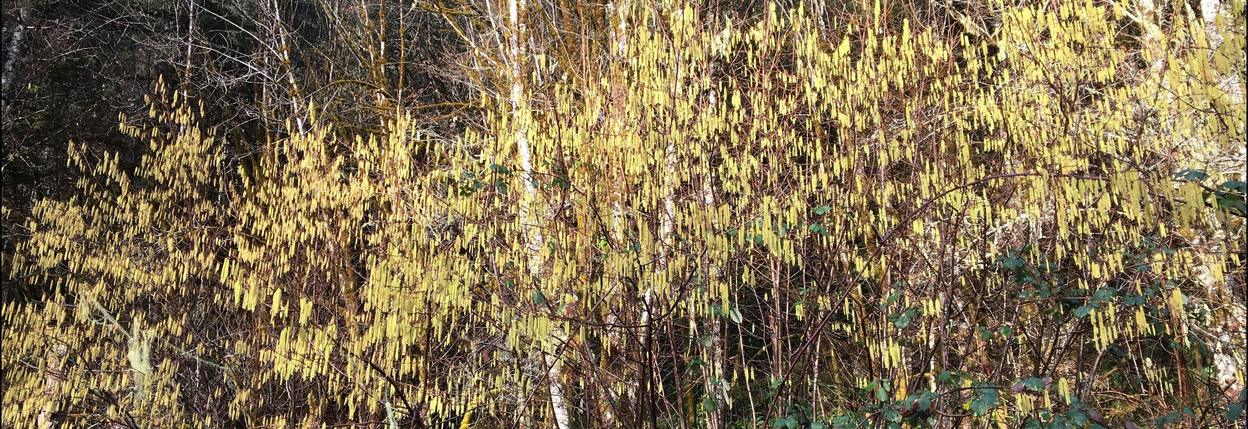 - Almost nothing is blooming yet, with the cold we’ve had. Only twelve species have bloomed (including hazel, above), and none of them the giggling, gurgling effusive types, even though thirty-one have had earliest flowering dates by now in our nine-year record. But that means we’ll have a lot of burgeoning beauty in the month to come, including the nineteen tardy ones and some of the thirty-seven more that can bloom in March, to be followed the the other two hundred thirty seven in the rest of the year. Weather, bring them on!