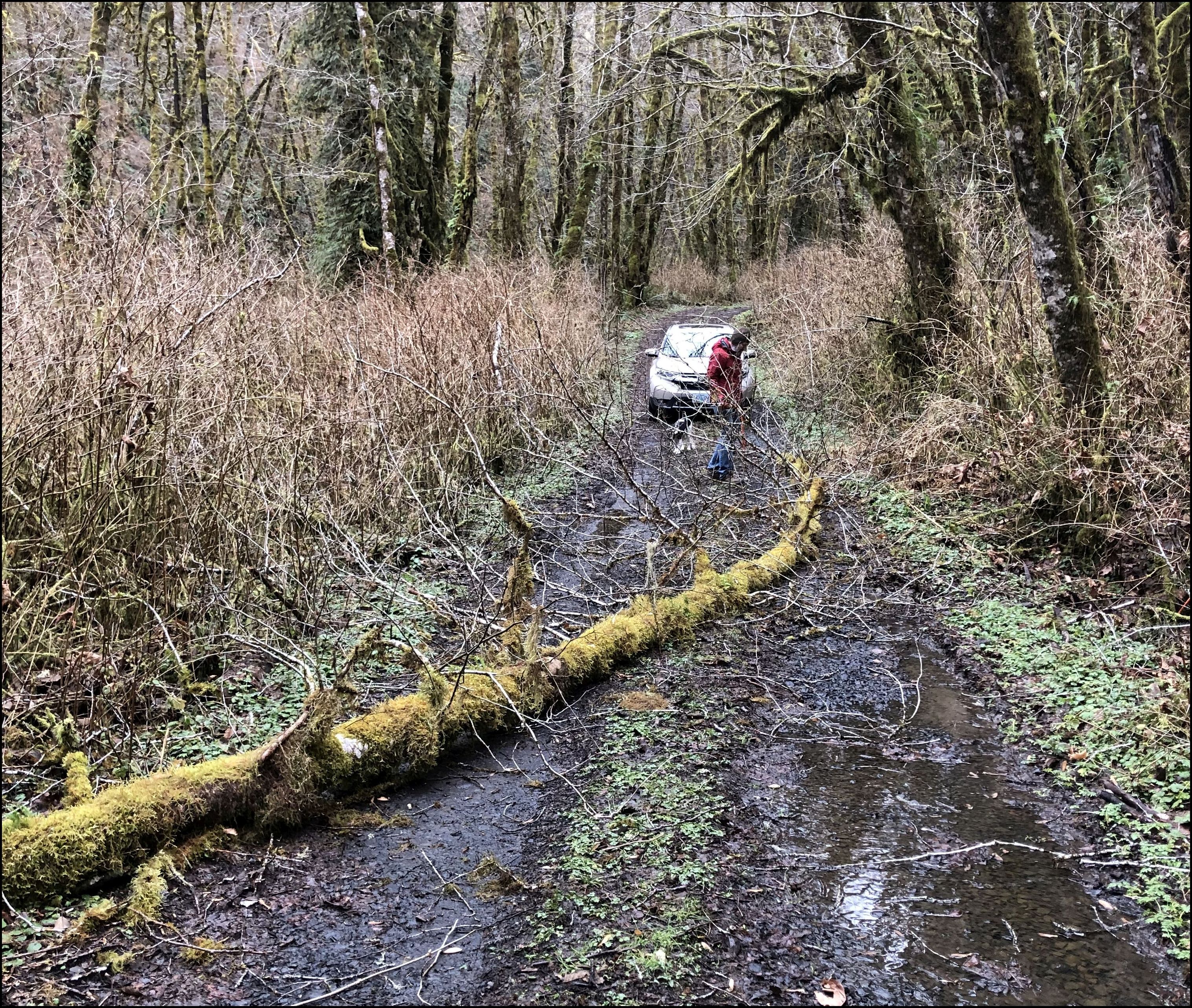 - We went out mid-week to collect maple sap, and ran into three trees across the road. But the first (this photo) we pulled to the side (at least for now), the second we got through with a handsaw, and only the third, which was closest to our cabin, needed the chainsaw.