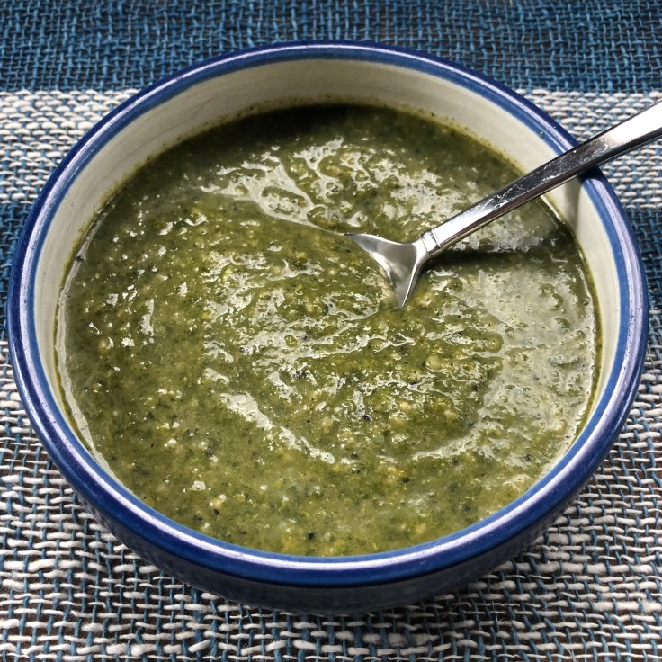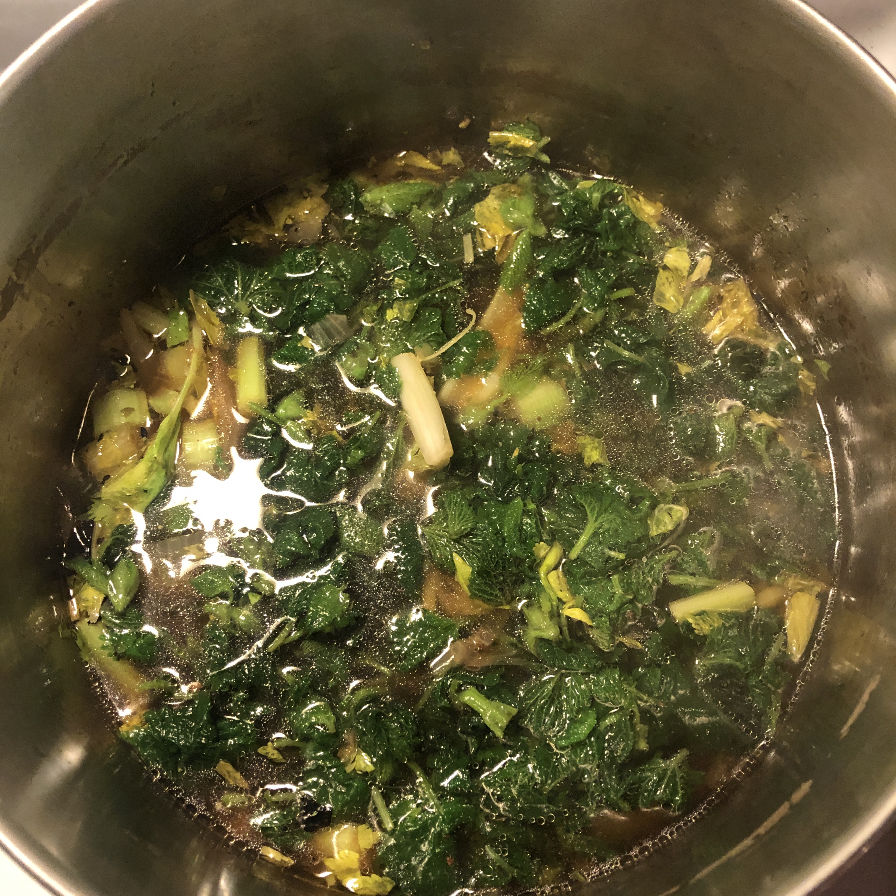 After I have “enough,” maybe sixty or eighty tips, I return to the kitchen. I then lift the shoots one at a time (my left hand in a plastic bag again, scissors in my right), and clip the leaves and terminal bud into a bowl, and discard the stem. I fill the bowl with water and swirl it with tongs that I then use to lift the contents onto cookie sheets or cooling racks. I spread them thin so that if there are any little flying insects, they can depart, and if there’s the occasional caterpillar, I will see it. This time, I saw no bugs whatsoever probably because it’s early in the season and the weather has been cold. [An alternative method is to clip the leaves off after boiling the nettles. That way, you don’t need to wear a plastic bag. But I like handling the beautiful greenish red folded hairy foliage with its paired leaves. So pretty!] Now I’m ready to make soup! Here’s the ingredient list I used. You’ll need a blender or an immersion mixer.