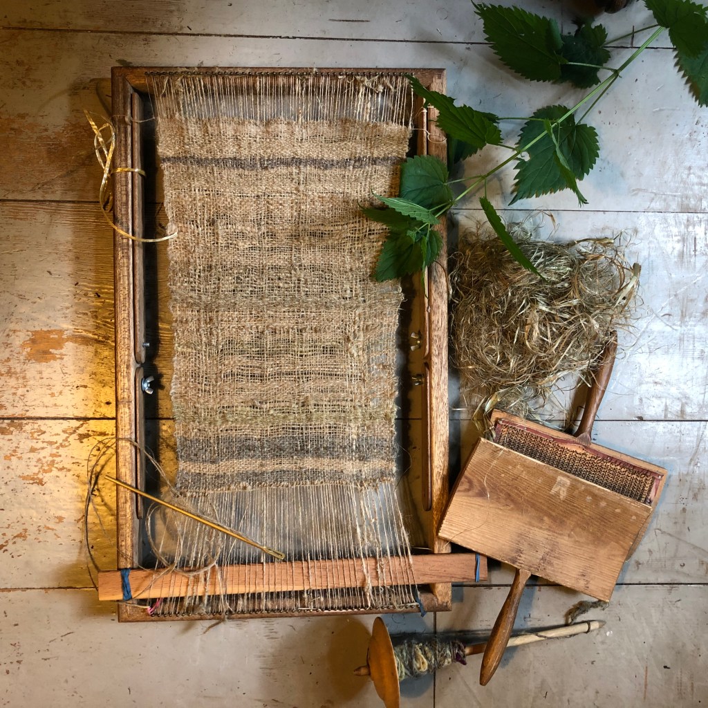 You’ve heard me rave—or rage?—about nettles, so you call to ask about my experiences. I tell you how I went down that same line of reasoning you did, and decided to let my fingers learn what my ancestors may have experienced. I made enough yarn to make a small wall hanging.