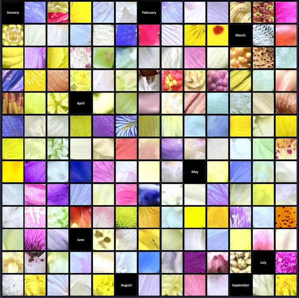 I have had the sensation that the mustard family is prime in the early spring and that the composites come on strong at the end of the season. When all the species are put together (natives, naturalized, and planted), I sense that the most colorful flowers bloom in the spring, and then there’s a long, long, long period when almost everything blooming is white. That doesn’t show so much in the montage above though. Still, I decided to take a petal from each of the flowers in the poster above, blow it up, and see if there was a strong trend in flower color. But as I did the project, I learned what artists surely know, that the colors I was blowing up aren’t true. often white flowers turned out looking pale aqua, and orange ones had pink tinges I don’t think were there in nature. My photography, done with my i-phone, doesn’t capture true colors, and the petals I enlarged for the next poster were heavily influenced by shadows. I don’t see any pattern in these natives, but they are pretty.